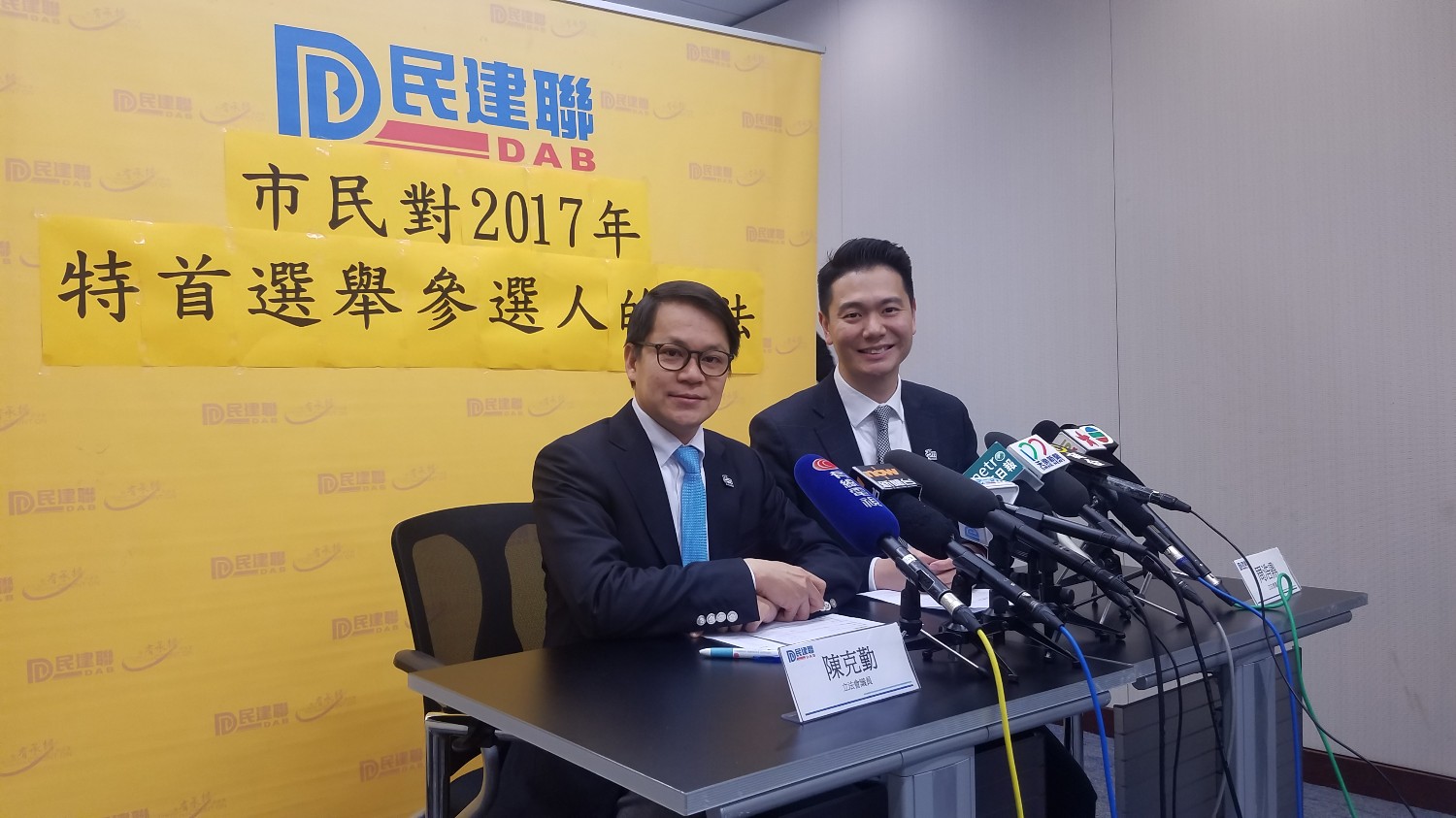 周浩鼎(左)与陈克勤公布特首选举民调结果。