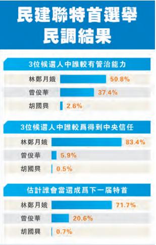 民建聯於本月16至20日期間,以電腦隨機抽取電話樣本,透過真實訪問員以電話問卷方式訪問了730名18歲以上的香港市民,發現有50.8%民意認為林鄭月娥較為有管治能力,至於曾俊華及胡國興則分別有37.4%及2.6%人認為他們較有管治能力。至於得到中央信任方面,有83.4%民意認為林鄭較為得到中央信任,曾俊華及胡國興則分別只有5.9%及0.5%認為他們得到中央信任。