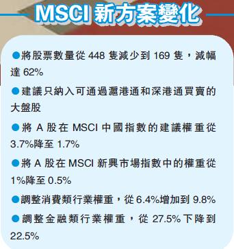 根據MSCI網站的演示文件,MSCI此次提出的有關將中國A股納入全球指數的縮小化方案,將股票數量從448隻減少到169隻;方案同時建議只納入可以通過滬港通和深港通買賣的大盤股;并計劃將A股在MSCI中國指數的建議權重從3.7%降至1.7%,在MSCI新興市場指數中的權重從1%降至0.5%。
