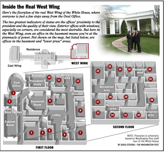 小布什政府時期白宮西翼布局圖,一樓左上角橢圓辦公室(Oral Office)為總統辦公地點(來源:華盛頓郵報)