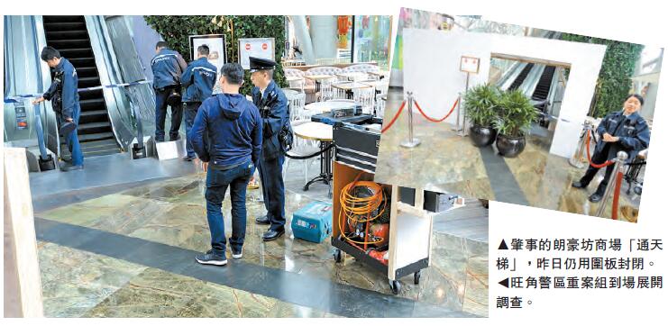 旺角朗豪坊商場昨晨如場營業,而肇事4樓通往8樓的「通天梯」上下行線,則仍暫停使用,商場用圍板將其圍封,地上仍留有不少血跡,另外由8樓往來12樓的扶手電梯亦暫停使用,顧客須改用升降機上落,至於商場內的其他扶手梯如常服務。