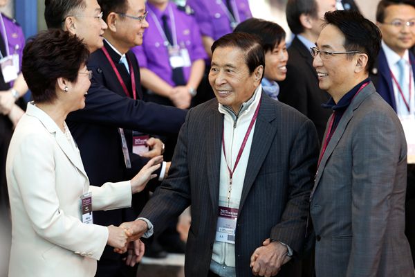 李兆基(中)和兒子李家傑與林鄭打招呼。