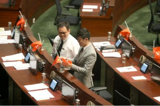 鄭松泰在立法會倒轉建制派議員桌上的國旗