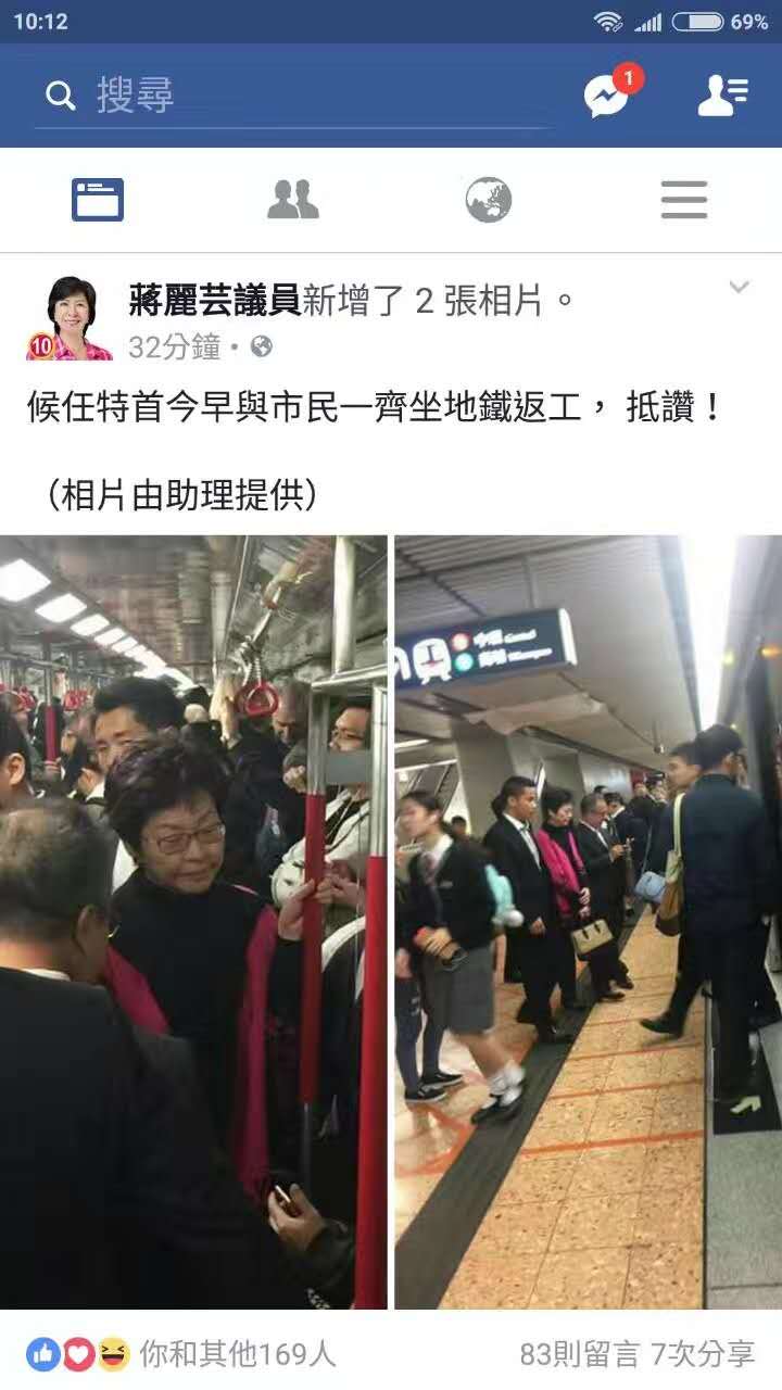 3月28日,香港立法會議員蔣麗云上載照片稱:候任特首林鄭今早與市民一齊坐地鐵返工,抵贊!(相片由助理提供)