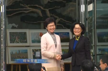 林鄭29日拜訪外交部駐港特派員公署,外交部駐港特派員公署署理特派員佟曉玲到門口迎接。