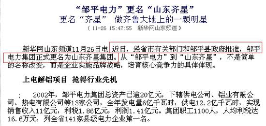 新華社2003年11月的一則報道透露了齊星集團的“前身”:經省市有關部門和鄒平縣政府批准,鄒平電力集團正式更名為山東齊星集團。