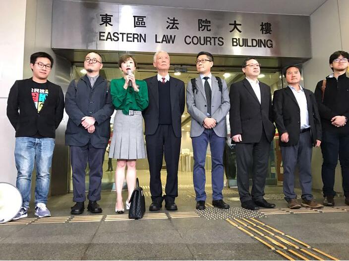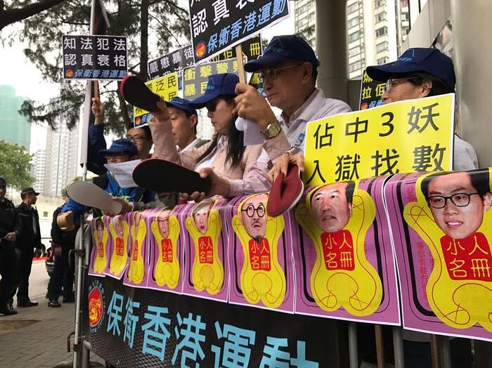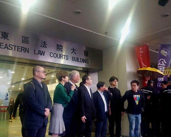 近百名支持泛民人士以及約50名保衛香港運動人士分別在法院外示威,期間雙方互相指罵,警方守在鐵馬前築成人鏈阻止,未有推撞。