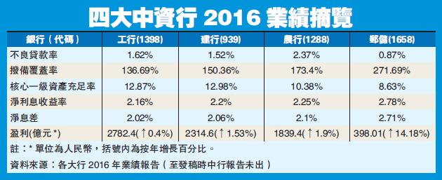 工行昨公布2016年業績,其中淨利潤為2782.4億元人民幣,按年增0.4%;不良貸款率為1.62%,按年升7%;撥備覆蓋率為139.69%,按年跌14.5%。另外,淨利息差為2.02%,按年跌13.8%;淨利息收率為2.16%,按年跌14.3%;核心一級資本充足率為12.87%,無升跌。