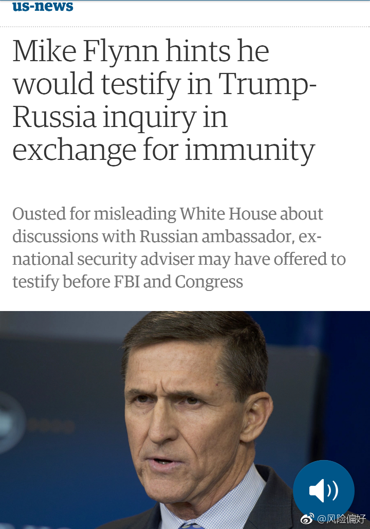 弗林的律師科爾那(Robert Kelner)最新表示,關于所謂的俄羅斯干涉美國大選,弗林“有故事”要向國會聽證會講,他希望作證,但需要防止“不公平的起訴”。