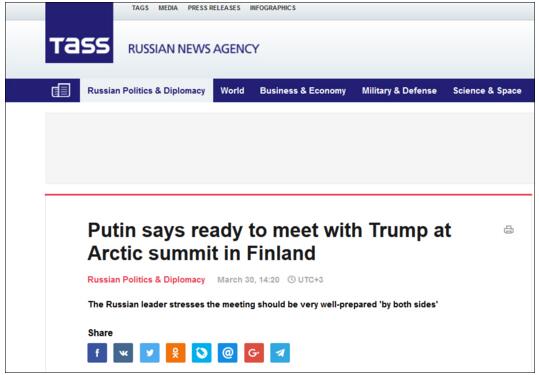 芬蘭是北極峰會的輪值主席。新華社報道稱,芬蘭總統尼尼斯托當日在論壇上表示,歡迎普京和美國總統特朗普參加將在芬蘭舉行的北極峰會,使兩人有可能見面。