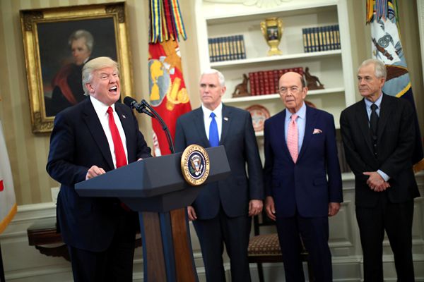 保護主義政策始於特朗普1月23日簽署的總統令,內容為永久退出TPP,代之以與各國締結對美國有利的雙邊貿易協定。特朗普還表明將重新與加拿大、墨西哥就目前的北美自由貿易協定(NAFTA)進行談判。其經濟政策亮點的稅制改革中,為促使遷至海外的工廠重返美國,正在討論降低美國出口企業稅務負擔、對進口企業增稅的「邊境稅」。