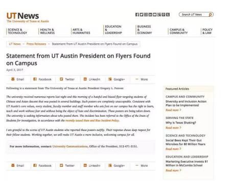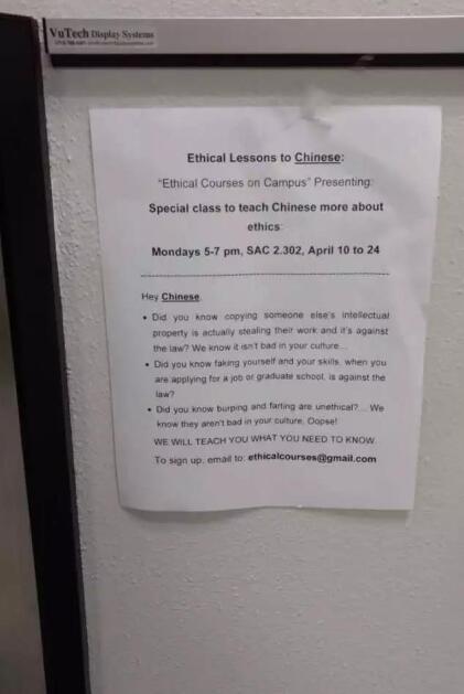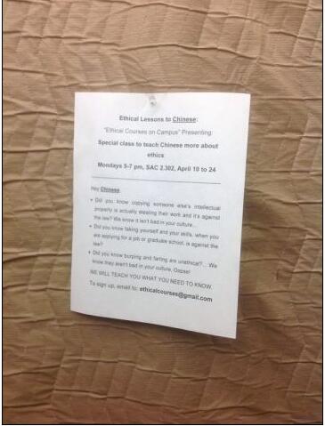 2日晚,有UT學生在工程學院樓中發現有人張貼帶有辱華內容的傳單。傳單標題是“為中國人開設的道德課”,其中“中國人”下面還加了下劃線。正文則嘲笑中國學生打嗝、放屁,并影射中國學生在學術上抄襲,在學歷、求職中造假等,并標注這門“課程上課”的時間地點。