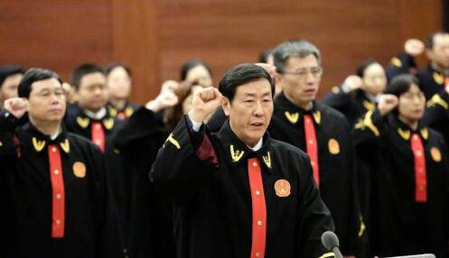 資料圖:2016年12月26日,中國最高人民法院舉行新任法官憲法宣誓活動。圖為沈德詠領誓。 中新社記者李慧思攝