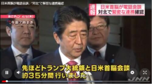 電話會談結束后,安倍晉三對媒體表示:“剛才同特朗普總統進行了約35分鐘的日美首腦會談,雙方深入交換了意見。朝鮮強行發射彈道導彈是危險的挑釁行為,對于我國的安全保障是重大威脅的認識達成了一致。”