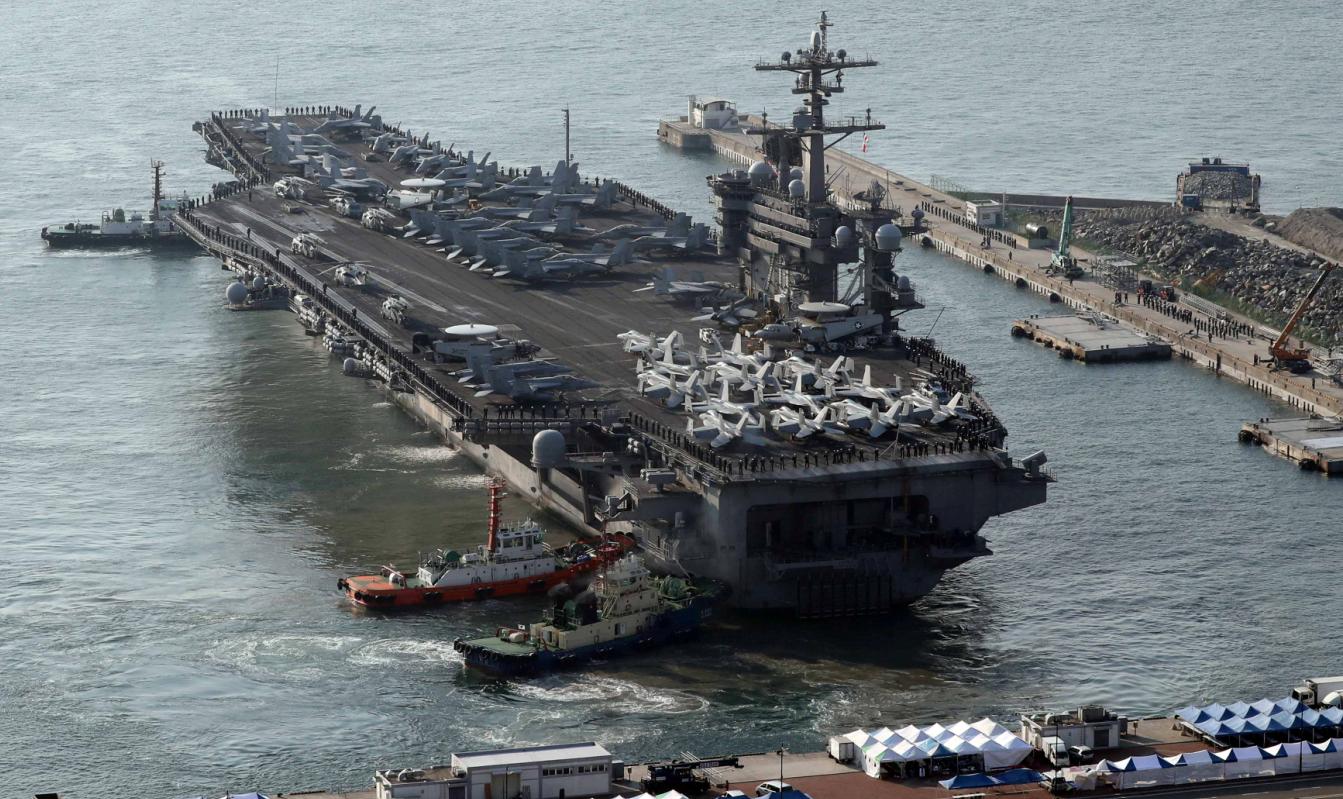 「卡爾文森」航母改變原定駛往澳洲的任務計劃,轉往朝鮮半島附近水域展開行動。圖為該航母上月停泊在釜山港,准備參與代號「鷂鷹」的韓媒聯合軍演。