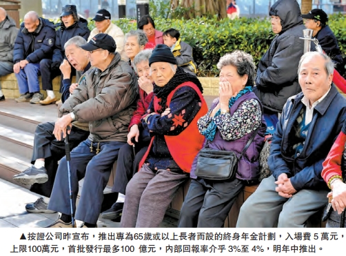【香港商報网訊】記者鄺偉軒報道:按證公司昨宣布,推出專為65歲或以上長者而設的終身年金計劃,入場費5萬元,上限100萬元,首批發行最多100億元,內部回報率(IRR)介乎3%至4%,明年中推出,期望最少1萬人受惠。按證公司總裁李令翔稱,若投資表現未達標,將由按證公司「包底」。
