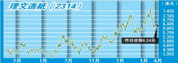 商務部上月公布,決定對歐盟、美國和日本的進口相紙反傾銷措施進行期終複審,調查自2017年3月23日起開始,再加上近期內地宏觀數據見回暖,市場預期將為內地紙業公司改善經營環境。理文造紙(2314)公布去年底止業績,純利28.63億元,按年增長22.8%。每股盈利62.64仙,按年增長24.2%,更派末期息11仙,比上年度同期派9.5仙亦維持增長。計及中期息,股份全年共派息22仙;期內收入按年增4.1%至183.42億元,毛利按年增14%至40.81億元。