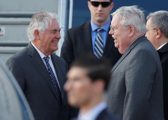 美國國務卿蒂勒森(左)昨日抵达莫斯科机场,美国驻俄大使泰福特前往迎接。路透社