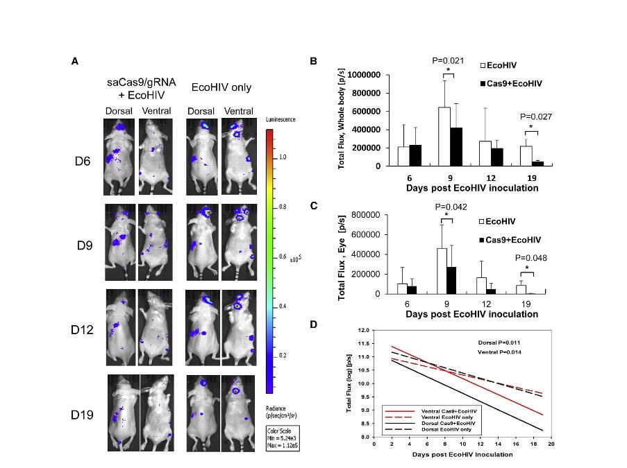 新研究更进了一步。他们首先向小鼠体内移植人体骨髓(B)、肝脏(L)和胸腺(T)组织或细胞,“重编程”出人源化BLT小鼠,使其具有与人类一样的艾滋病病毒感染及其潜伏方式。然后,以腺相关病毒(AAV)作为载体,把有“基因魔剪”之称的CRISPR/Cas9基因编辑工具运送到潜伏感染艾滋病病毒的人源化BLT小鼠体内。2到4周后,他们对小鼠多个器官组织进行检测后发现,艾滋病病毒基因组被有效切除。