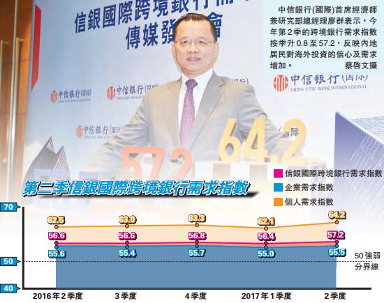 信銀國際昨日發布第二季信銀國際跨境銀行需求指數報告,該指數按季升0.8,至57.2,企業需求分指數與個人需求分指數則分別錄值55.5與64.2,升0.5與2.1,反映在內地經濟增長企穩、美國經濟復蘇加速、內地企業「走出去」步伐加快、人民幣貶值速度放緩等積極因素推動下,內地企業與個人對於香港跨境銀行服務需求的增長速度明顯回升。