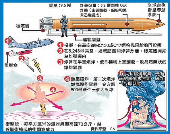 GBU-43炸彈重9.5噸,綽號「炸彈之母」。這是美軍首次在實戰中動用這種大型炸彈,該炸彈也是美軍在作戰中所用最大的非核炸彈。路透社