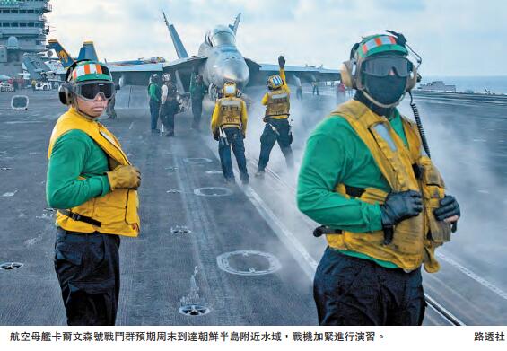 美情報官員還稱,美國已向朝鮮半島附近派駐兩艘可發射戰斧導彈的驅逐艦,其中一艘距離朝鮮可能的核試驗地點僅300英裏。另外,預期周末到達朝鮮半島附近水域的航空母艦卡爾文森號戰鬥群,以及位處關島的重型轟炸機可以隨時支援,行動可能還包括網絡攻擊和派遣地面特種部隊等。俄羅斯連塔網也援引俄相關機構消息人士透露,開赴朝鮮半島附近水域的美國海軍艦群中,至少包括一艘攜帶154枚戰斧巡航導彈的改進型俄亥俄級核潛艇。這名消息人士說:「我們有關於美軍兵力,包括潛艇動向的情報。至少有一艘美軍潛艇位於太平洋西部,它所處的區域使其可以向朝鮮境內目標發射導彈。」