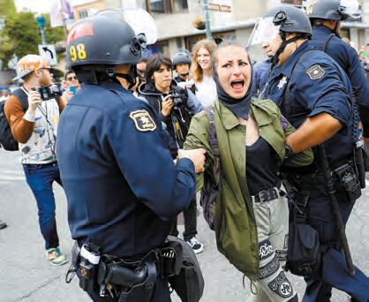 在加州伯克莱的示威游行中,有涉嫌滋事的群众被警方带走。路透社