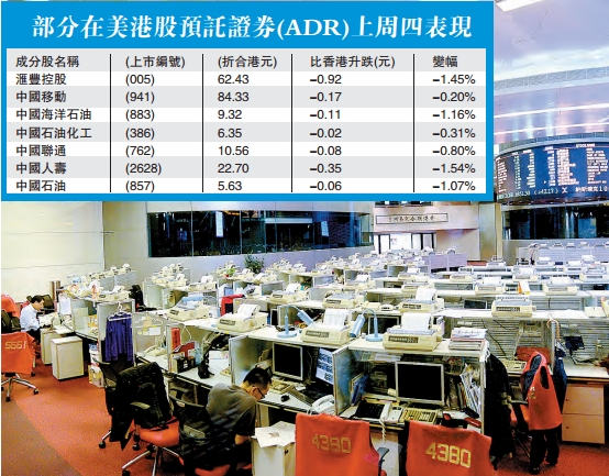 承接上周四道指下跌138點,香港主要藍籌在美上市的預託證券(ADR)普遍偏軟,汇豐控股(005)及中國人壽(2628)ADR分別較本港收市跌1.45%及1.54%,另中國海洋石油(883)及中國石油(857)ADR亦比香港收市插1.16%及1.07%。按比例計算,恒指周二料低開126點,見24135點。