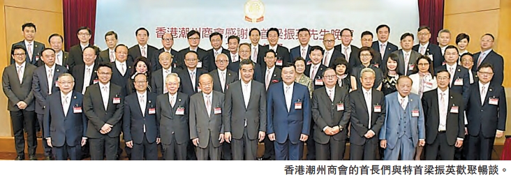 梁振英向該會為香港的繁榮穩定作出的努力和貢獻表示感謝,并鼓勵商會同仁繼續當好溝通海內外潮籍商界、鄉親的平台和橋梁,利用粵港澳大灣區的難得機遇,為國家、為香港發揮更大的作用。他續指,潮商在歷史上對東南亞的影響頗大,經貿人脈廣闊,而香港則處「21世紀海上絲綢之路」的重要位置,潮商可以發揮的作用明顯且重要。