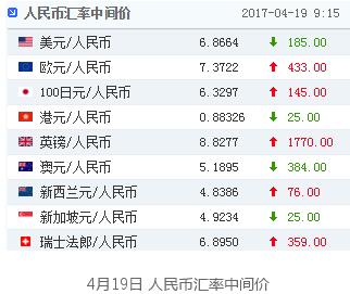 4月19日,人民幣(6.8828, 0.0051, 0.07%)兌美元中間價報6.8664,較上日中間價6.8849升值185個基點。上日官方收盤報6.8852,夜盤收盤報6.8860。