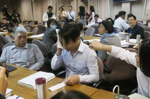 徐永明進入“立法院”前,遭群眾拉扯,襯衫釦子被扯掉,也被群眾潑水,頭發、上衣都濕透