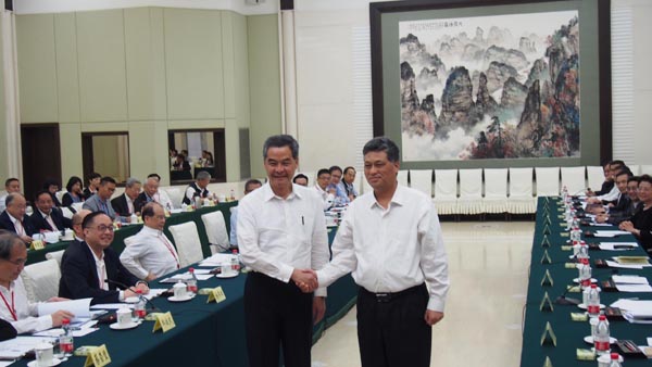 昨日座談會前,行政長官梁振英(左)與廣東省省長馬興瑞握手。記者葉佩瑜、何加祺攝