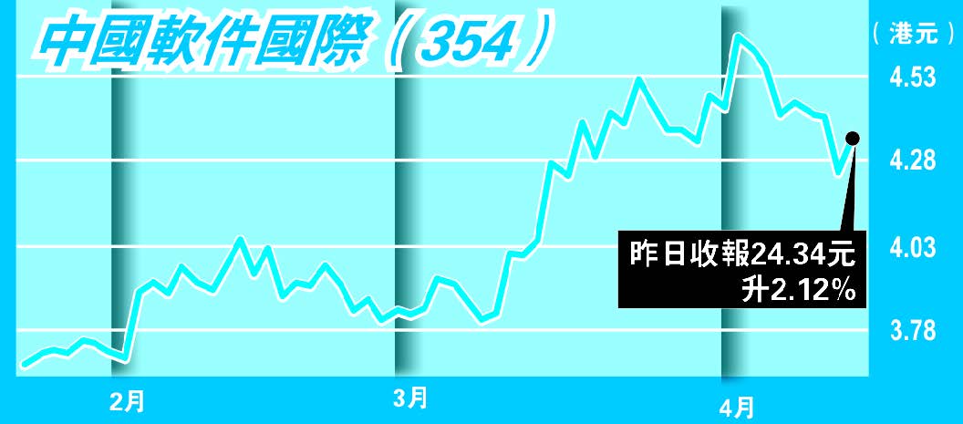 個股方面,中軟國際(354)去年收入上升32.3%至67.8億元人民幣,毛利亦增加32.3%至20.1億元人民幣,毛利率保持在29.7%水平,盈利更增長57.9%至4.4億元人民幣。公司日前與中國結算簽訂總部數據倉庫系統應用開發維護項目合同,向中國結算提供大數據解決方案和技術開發服務,提高業務風險防範能力,並支撐未來與金融監管部門數據共享開放的需求。預期未來公司在證券行業將有更多業務機會。內地資金積極透過港股通吸納公司股份,有助公司估值提升。建議於4.2元吸納,上望5元,跌穿3.8元止蝕。