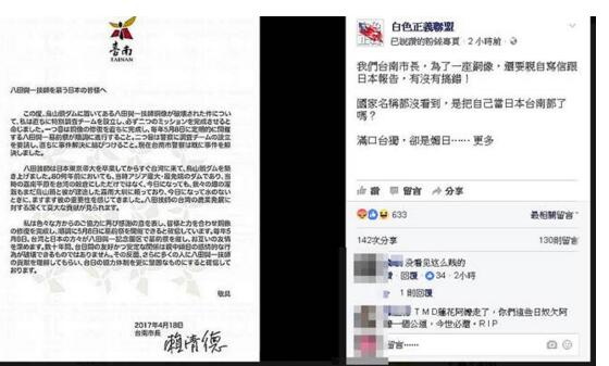 白色正義聯盟在Facebook粉絲頁發布一張日文信函,寫道“我們台南市長,為了一座銅像,還要親自寫信跟日本報告,有沒有搞錯!國家名稱都沒看到,是把自己當日本台南都了嗎?滿口台獨,卻是媚日,慰安婦都被你們犧牲掉了!”