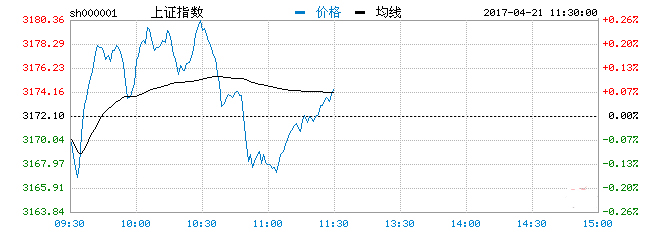 新浪財經訊 4月21日消息,滬深兩市早盤低開,盤中一度震蕩走高。早盤後半段時間,兩市指數快速回落。截止上午收盤,滬指報3174.40,漲0.07%,創指報1855.02,漲0.25%。
