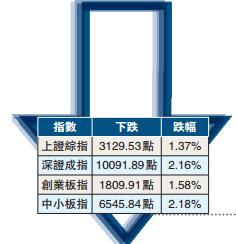 截至收盤,上證綜指報收3129.53點,跌幅1.37%,成交1978億元(人民幣,下同);深成指報收10091.9點,跌幅2.16%,成交2141億元;創業板指報收1809.91點,跌幅1.58%,成交535.5億元。至此,大盤維持了86個交易日收盤跌幅不超1%的紀錄被打破。