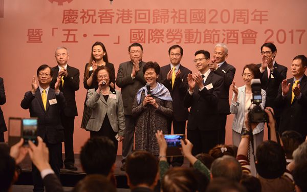工聯會昨晚舉行「五一」國際勞動節酒會,近1000名工會代表出席。另外,出席嘉賓還有行政長官梁振英、候任行政長官林鄭月娥、中聯辦副主任林武、外交部駐港特派員公署副特派員宋如安、解放軍駐港部隊副政委陳亞丁大校、立法會主席梁君彥及行政會議召集人林煥光等。