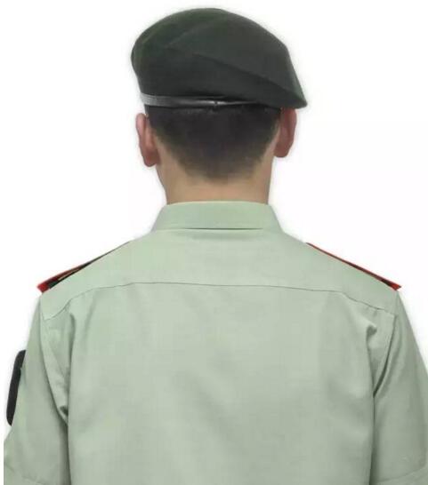 在室內參加會議、學習、教育或就餐時,可以將貝雷帽統一放在桌(臺)前沿左側或桌斗內,也可以掛在衣帽鉤上;不便放置時,可以置于左肩袢下。