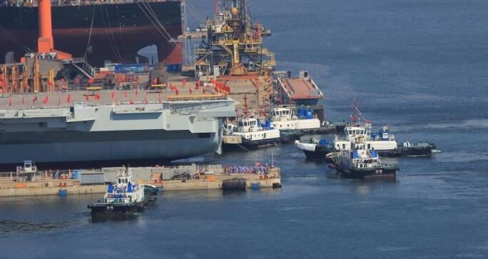 10點05分左右,在六艘拖輪的“護衛”下航母完全出塢。