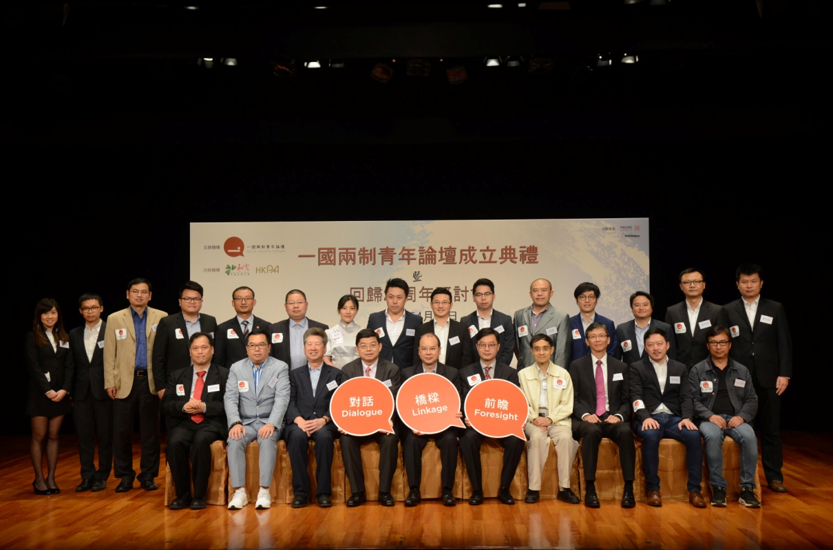 「一國兩制」青年論壇成立典禮暨回歸20周年研討會昨在港舉行,政務司司長張建宗(前排左五)和中聯辦法律部部長王振民(前排左四)獲邀擔任主禮嘉賓。記者 蔡啟文攝