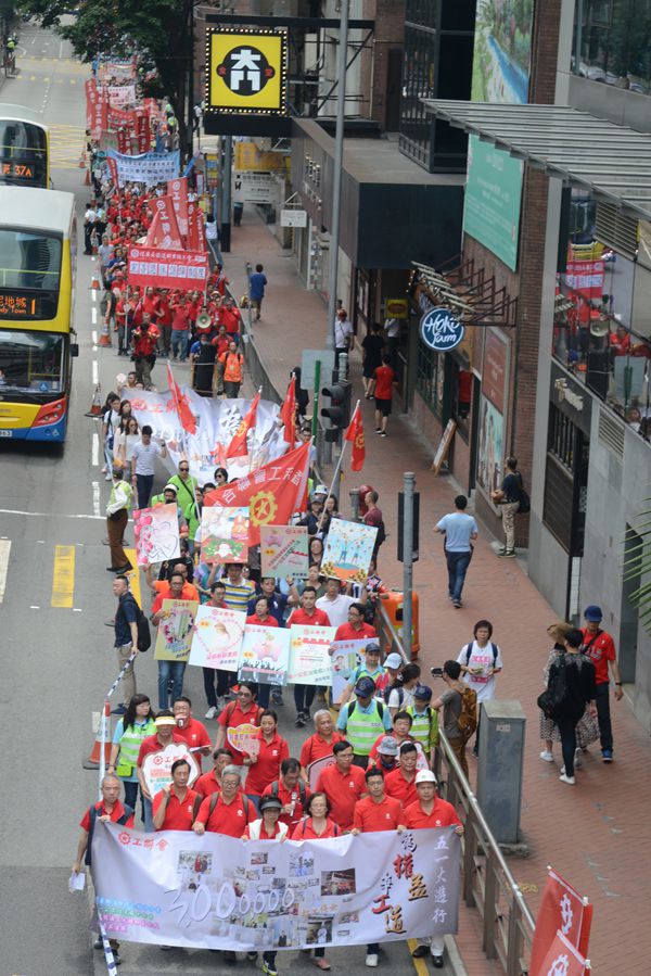 工聯會聯同多個勞團昨早在灣仔修頓球場集會,其后沿軒尼詩道游行至政府總部。參與游行人士拉起橫額,沿途高叫「為權益,爭工道」、「支持取消強積金對沖」等口號,團體要求政府盡快取消強積金對沖、統一法定公眾假期,以及檢討男士侍產假、女士產假等。據大會稱,集會及游行有逾4000人參加。