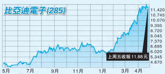 走勢上,比亞迪電子沿10天線向上突破,可考慮11.3至11.5間吸納,上望目標13元,穿9.4元宜止蝕再作部署。