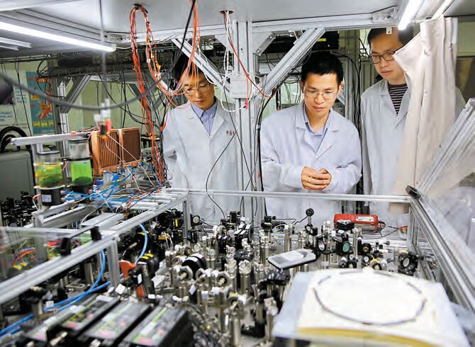陆朝阳教授(中)和学生们检查光量子计算机的运行情况。新华社