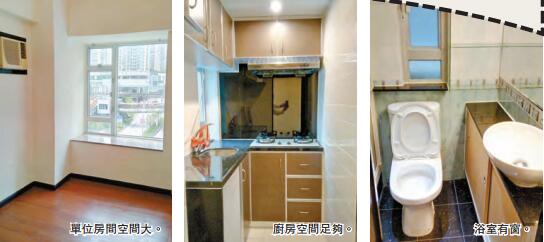整體而言,單位目前帶簡單裝修,白色牆身配木地板,簡約之餘不顯陳舊。單位並無玄關位置,客飯廳亦無明顯分區,用戶設計傢俬擺放時相對容易。廚房算是全屋亮點,除空間足夠,目前裝潢亦較典雅。浴室空間稍細,但有一窄窗,起到通風及採光作用。兩間房間雖有柱位,窗台亦稍大,空間仍然夠大,實用度不低。