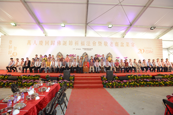 普門基金會主席李月華與一眾嘉賓「萬人慶回歸佛誕節祈福法會暨敬老齋盆菜宴」。