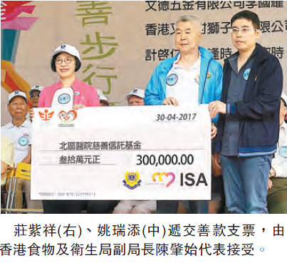 【香港商報網訊】莊紫祥慈善基金會創會主席莊紫祥,聯同香港又一村獅子會創會會長姚瑞添及獅友,各界愛心人士等一行,組織慈善步行團,出席北區醫院一年一度為醫院步行籌款的活動,今年共籌得200多萬善款。該慈善步行團從各界籌得12萬善款,莊紫祥慈善基金會連同香港又一村獅子會、ISA三個單位,再捐款30萬予北區醫院慈善基金。圖為莊紫祥(右一)、姚瑞添(中)遞交善款支票,由香港食物及衛生局副局長陳肇始代表接受。
