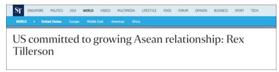 “蒂勒森:美國承諾增強東盟關系”,截圖來自海峽時報5月5日報道