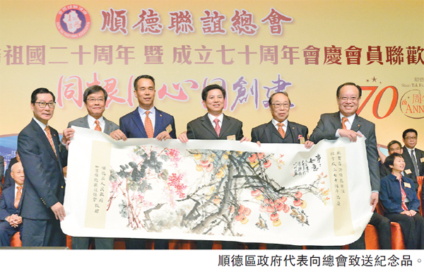 【香港商報網訊】記者洪紫瑩報道︰順德聯誼總會慶祝香港回歸祖國20周年暨成立70周年會慶晚宴,日前於灣仔會展圓滿舉行。行政長官梁振英,中聯辦副主任林武,順德區區長彭聰恩,佛山市委常委、統戰部部長黃喜忠及佛山市政協主席熊志翔等擔任主禮嘉賓。晚宴筵開近140席,場面盛大。