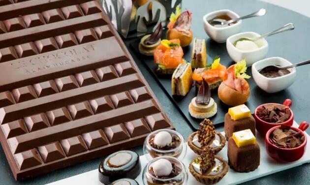 焦點甜作包括特濃黑朱古力批、朱古力慕絲、維也納芒果朱古力蛋糕、咖啡朱古力慕絲配蕎麥雪糕及榛子脆朱古力甜點。另配搭龍蝦西芹軟包、黑松露芝士火腿三文治、法國鴨肝醬配朱古力和煙三文魚麥包三文治四款滋味小食。