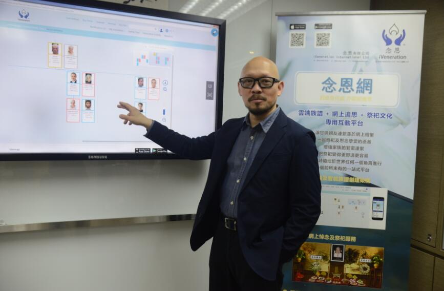 據Anthony介紹,念恩網現時提供三項基本功能,包括雲端建立族譜、先人紀念頁及悼念祭祀先人活動。用家首先要開設帳戶,創建先人檔案,由此在雲端上建立族譜,最多可儲存十代族譜及率先顯示前三代人的家庭樹(Family Tree),系統會按照出生年份和添加的人物位置,自動偵察家族關系,形成大包圍的族譜。有了家庭族譜后,便可以與家人將一些難忘照片、聲音檔案及視頻等寶貴記憶存儲在家庭時間表中,形成猶如Facebook的動態時報﹙Time-line﹚,方便與世界各地的親戚分享及回顧先人一生的點滴;最后便是悼念先人,系統現時提供四個宗教,包括天主教、基督教、佛教及道教的祭祀儀式。用家可以按照先人的喜好,於平台透過點數購買并獻上不同類別的花束及祭品。